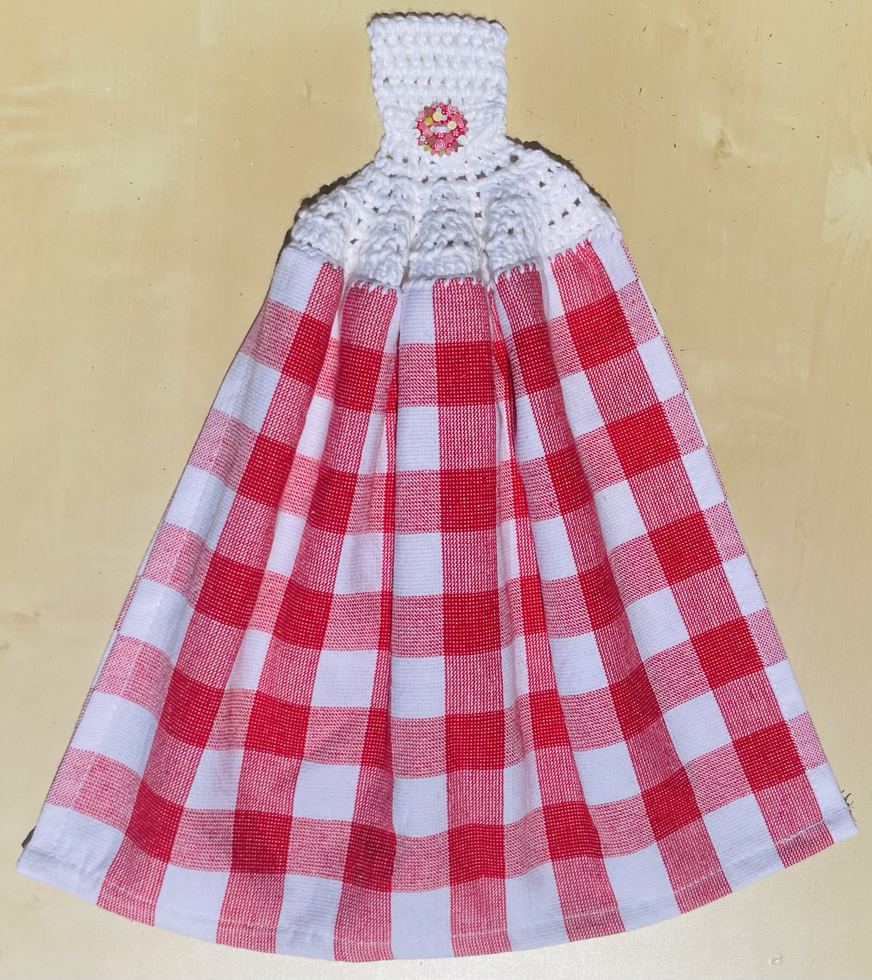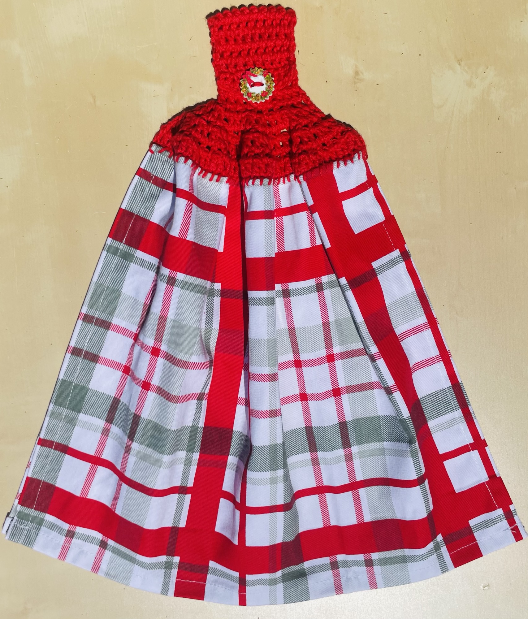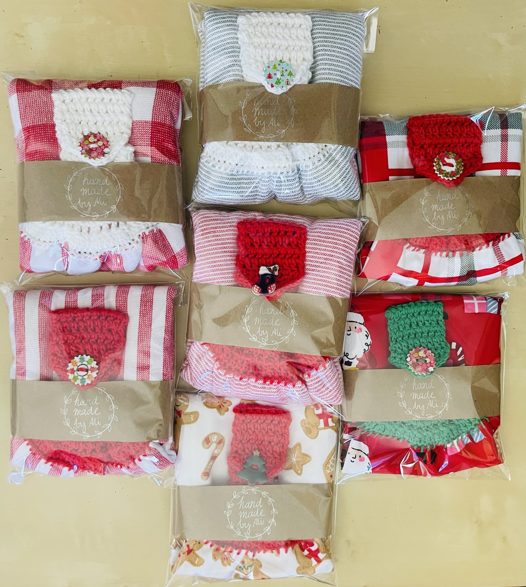 Hand crocheted 100% cotton yarn toppers sewn onto Christmas themed tea towels. Featuring Christmas themed buttons! Normal machine wash. Line dry.