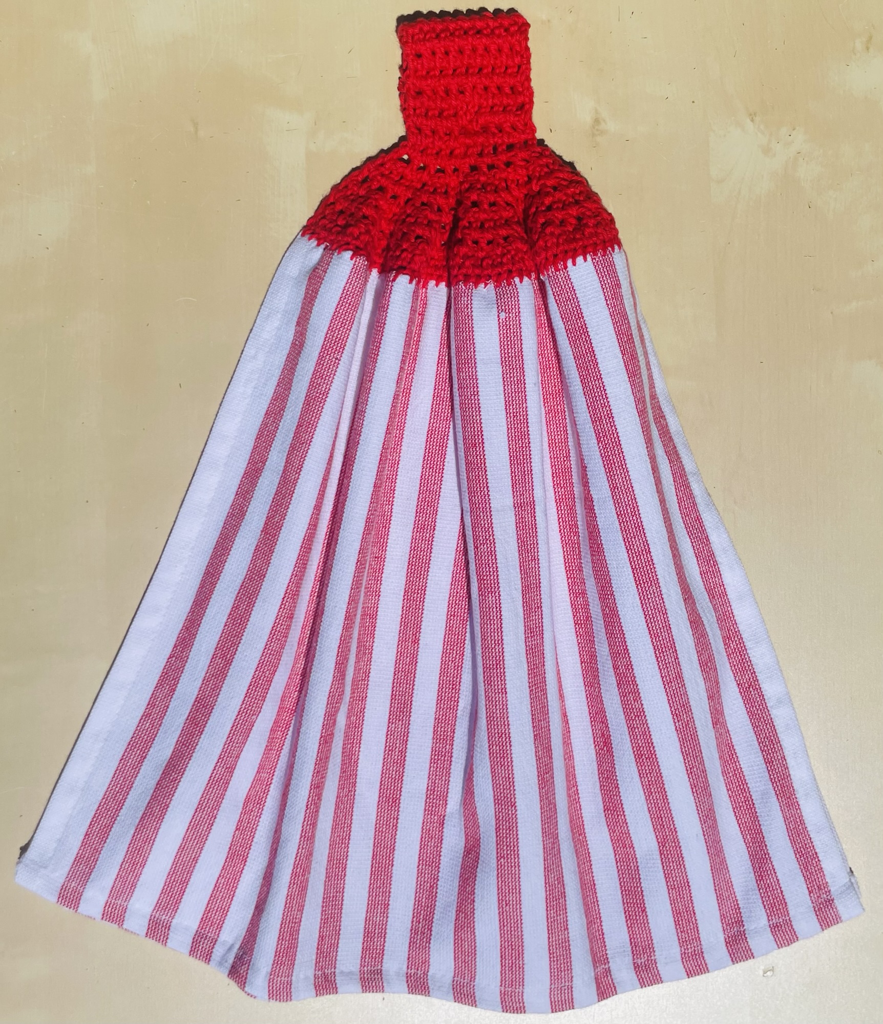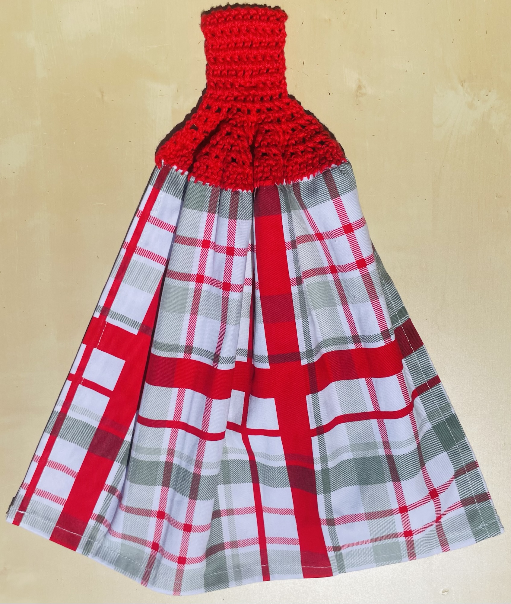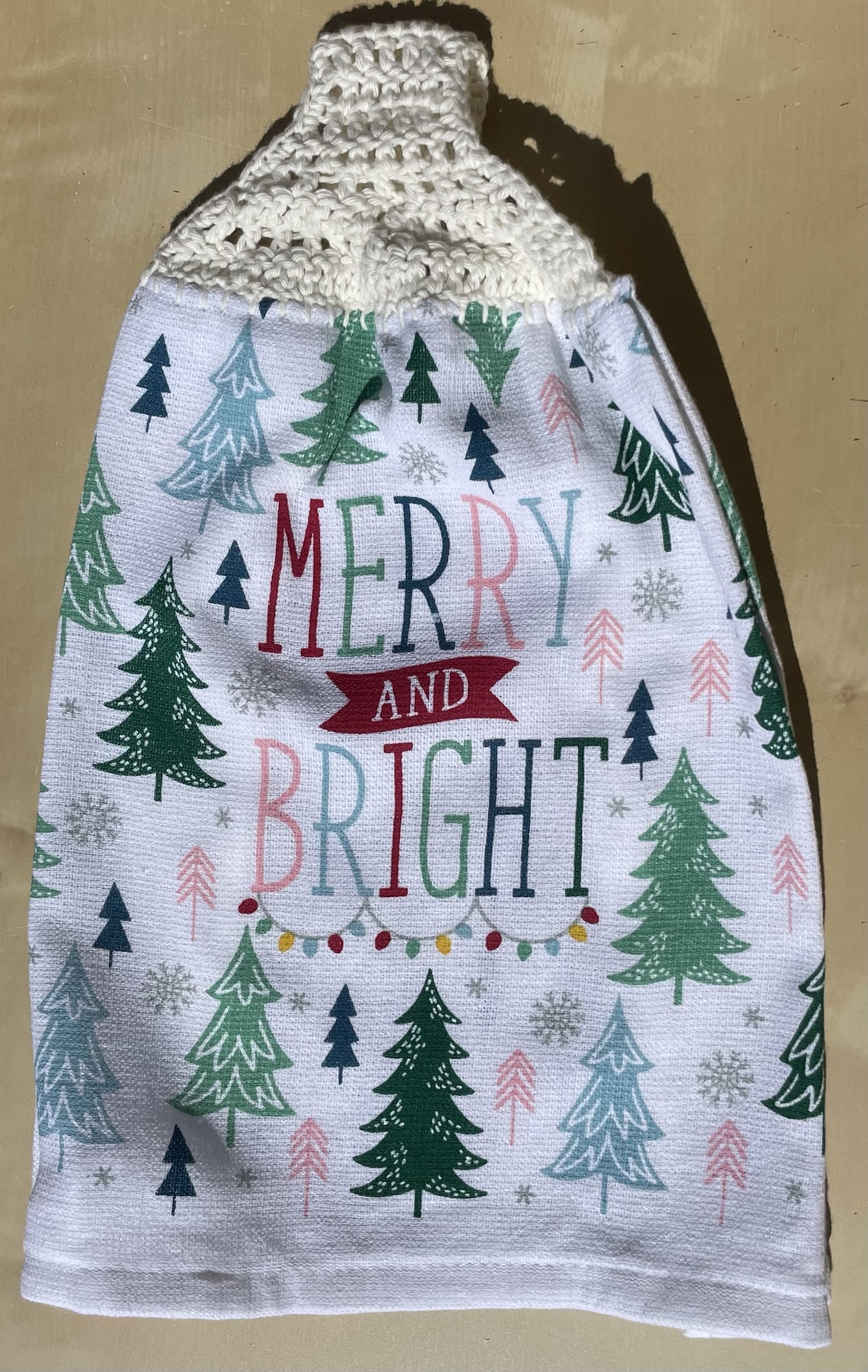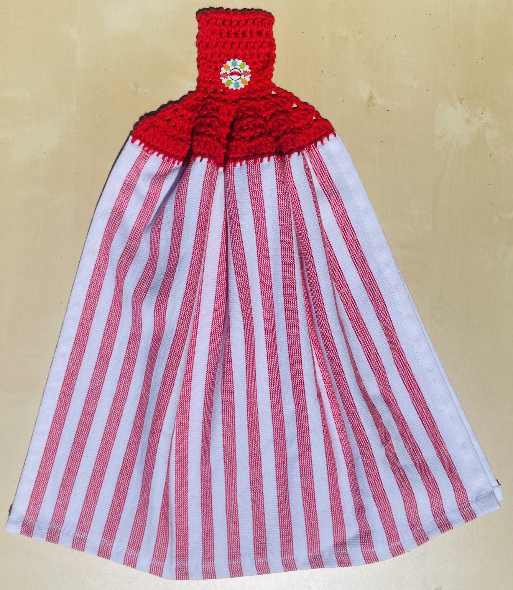 Hand crocheted 100% cotton yarn toppers sewn onto Christmas themed tea towels. Featuring Christmas themed buttons! Normal machine wash. Line dry.